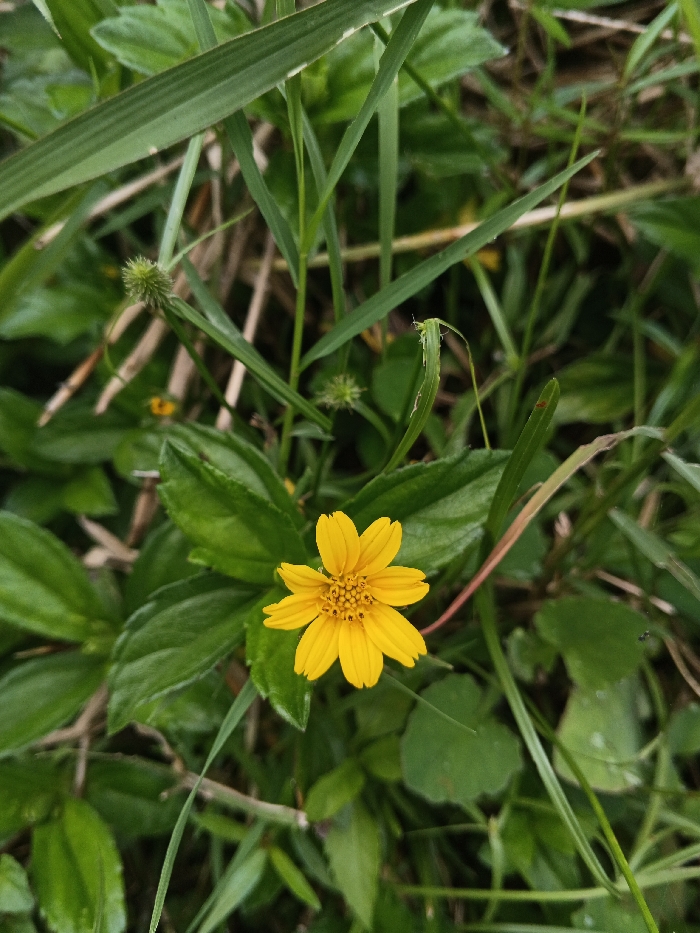 A vibrant yellow daisy-like flower with a densely packed center sits amidst a tangle of green foliage. The petals are smooth and radiate evenly around the central disc. Various leaf shapes and shades of green provide a textural backdrop, with some long, slender blades of grass intermingling with broader, rounded leaves. A few spiky seed heads are visible, adding to the scene's natural and slightly wild aesthetic.