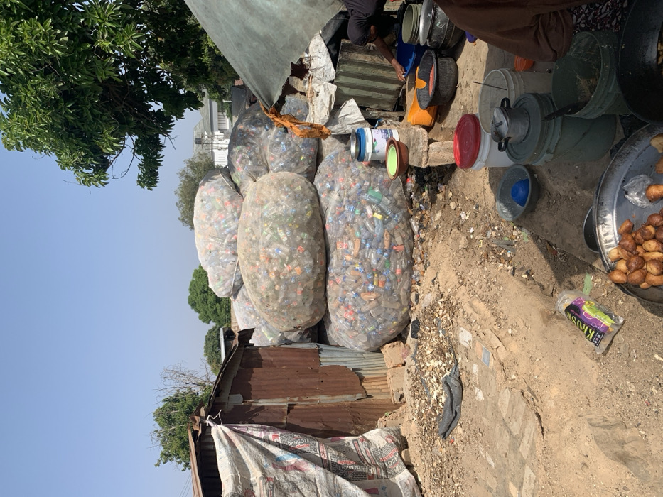 The image portrays an outdoor scene in Jos, Nigeria, featuring a significant collection of plastic waste and informal commercial activity under a clear, bright blue sky