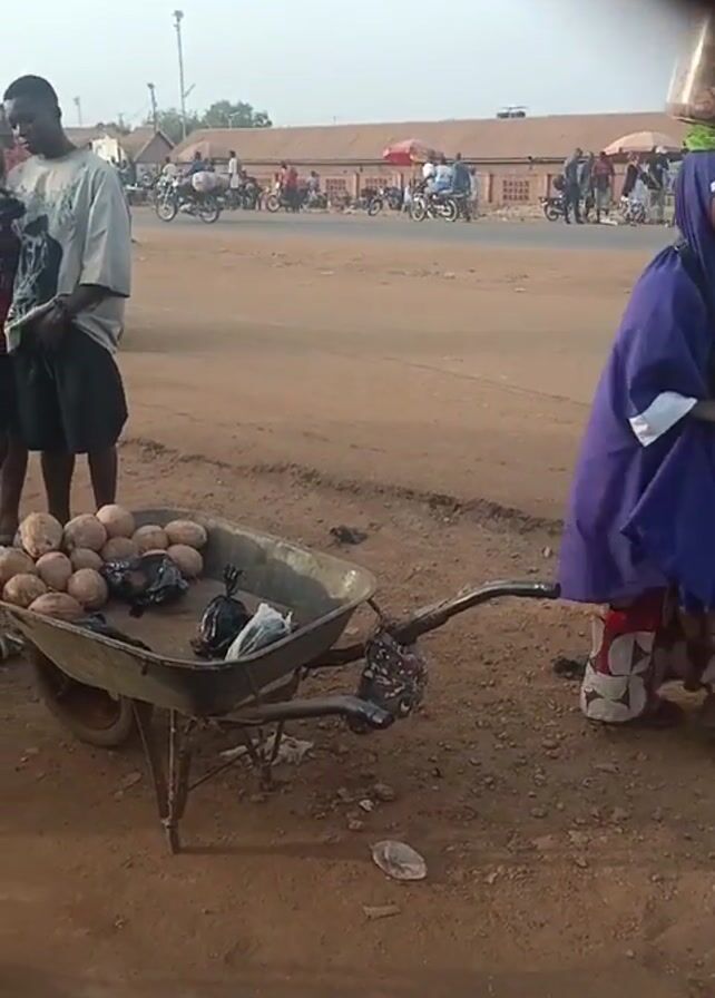 Here's a detailed description of the scene: The video depicts an outdoor street scene, likely in an African country, characterized by a reddish-brown dirt ground. Several people are present. Initially, a woman wearing a hijab and carrying a container on her head stands next to a wheelbarrow filled with coconuts. The camera angle shifts slightly, and the woman moves out of the frame. Several men and a younger person wearing a red shirt stand around the wheelbarrow, appearing to be in conversation. Motorcycles and other vehicles are visible moving in the background, along with buildings and stalls, suggesting a market or busy roadside area. A man wearing a bright green shirt pushes a second empty wheelbarrow toward the group standing around the first wheelbarrow filled with coconuts.