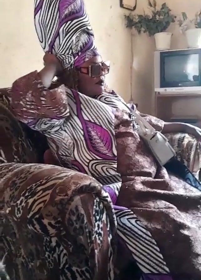 A video shows a woman sitting in an armchair. She is wearing a tall, patterned head wrap in white, black, and purple, as well as large sunglasses. She has a patterned top and a long, brown dress made of lace. A small, white purse is slung across her body. The armchair has a brown and black animal print pattern. The woman is speaking. In the background, there are framed pictures on the wall, a small television set, and some potted plants. The room has a lived-in, homely appearance.