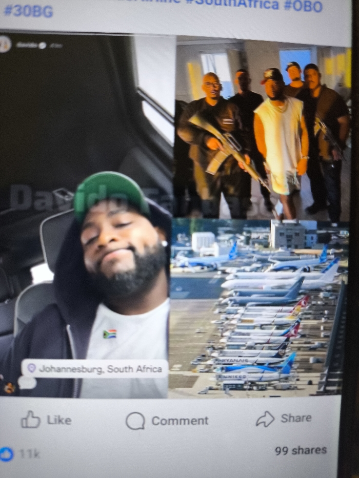 The image displays a photograph of a digital screen showing a social media post, likely from Facebook. The post is a collage of three distinct visual elements. At the top of the screen, partially visible hashtags include "#30BG", "#SouthAfrica", and "#OBO". Below this, a profile picture and "davido" with "41m" (likely denoting time posted) are present. The left half of the collage features a close-up of an adult male, appearing relaxed and slightly smiling, with dark skin, a neatly trimmed beard, and a light-colored stud earring on his left ear. He wears a dark hooded sweatshirt, a white t-shirt with a small South African flag emblem, and a green baseball cap worn backwards. He is seated, possibly in a vehicle, with a headrest visible behind him. A location tag "Johannesburg, South Africa" is overlaid on this section. Faint text, possibly "Davido", is visible in the background. The top-right quadrant of the collage shows five adult males standing together. The central figure wears a white sleeveless tank top, dark shorts, and a red baseball cap worn backwards. To his left, one man in dark attire holds a dark-colored rifle, possibly an AK-pattern weapon, pointed downwards. Another man behind him is also in dark attire. To the central figure's right, two more men in dark attire are visible; one on the far right also holds a similar rifle. The bottom-right quadrant depicts an aerial or elevated view of an airport tarmac densely packed with numerous parked commercial passenger aircraft, mostly large narrow-body and wide-body jets. The aircraft display various airline liveries, with prominent blue and white designs on several. Airport buildings are visible in the background. Below the collage, standard social media interaction buttons are present: a "Like" button with "11k" likes, a "Comment" button, and a "Share" button with "99 shares". No details within the image indicate a location in Nicosia, Northern Cyprus / Cyprus. The only explicit geographical reference provided is "Johannesburg, South Africa."