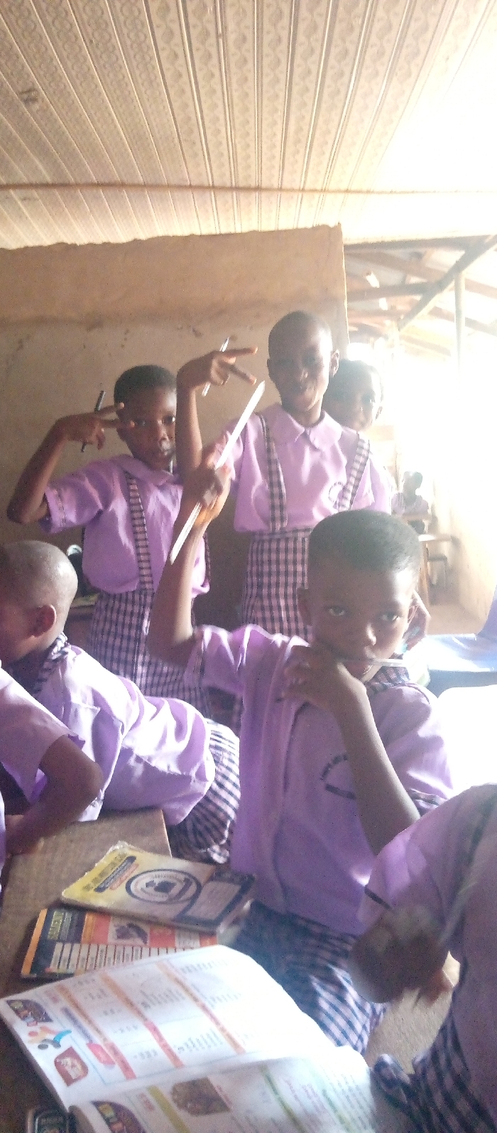 The scene depicts an interior, likely a classroom, in Ukwu-Abwa, Nigeria