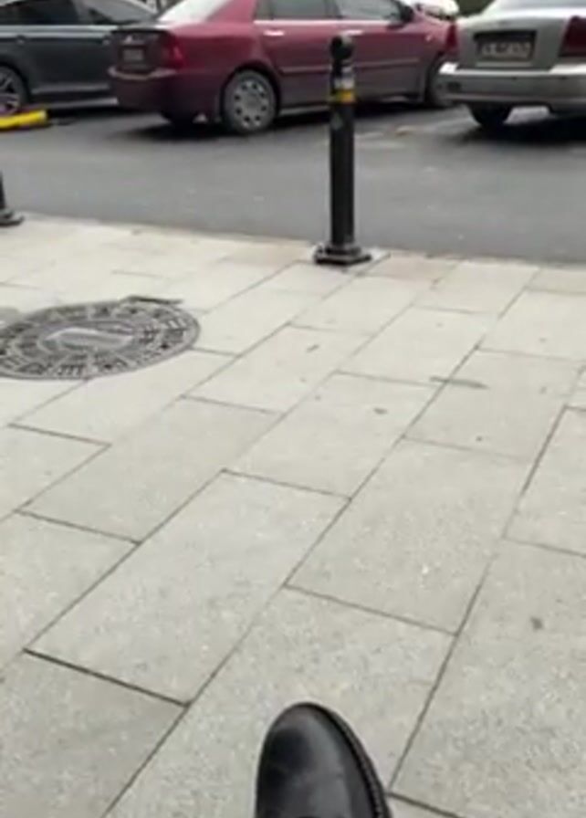 seated person with their lower leg visible, wearing a gray checkered pant and a black shoe with a white sock. The camera pans upwards to show a street with several parked cars and buildings in the background. The street is lined with a sidewalk paved with square tiles. A manhole cover is visible on the sidewalk. Black bollards stand between the sidewalk and the street. The sky is overcast.