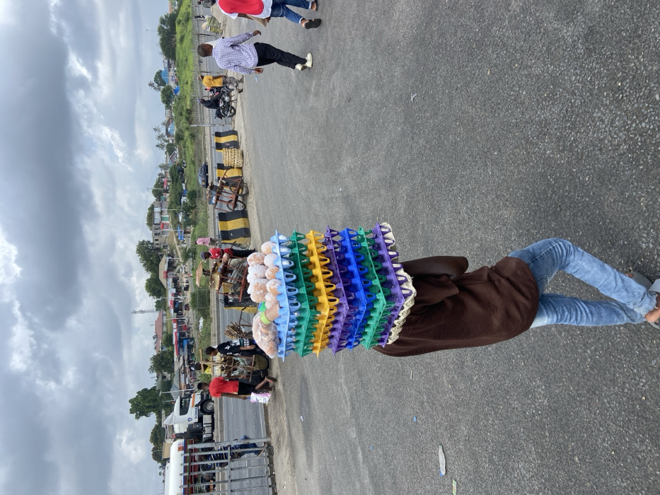 The image portrays an active urban roadside scene in Dar es-Salaam, Tanzania, under an overcast sky. In the immediate foreground, viewed from behind, a person walks on a gray asphalt surface, wearing a brown short-sleeved shirt, blue jeans, and light-colored sandals. They are balancing a tall stack of approximately seven colorful plastic egg crates on their head. The crates are stacked in alternating colors, including purple, blue, green, and yellow, with the top two crates holding numerous brown eggs. One of the top egg crates also contains a plastic-wrapped item. To the left, a large white Scania truck and a metal gate are partially visible. Along the paved roadside, several individuals are present, including two people wearing red shirts near traditional wooden pushcarts. These carts are positioned alongside yellow and black striped concrete barriers. Another person in a patterned shirt and jeans walks nearby. On the right side of the frame, multiple pedestrians walk away from the camera; one individual wears a plaid shirt and dark trousers, and another is in a red and white shirt. A motorcycle with a rider is visible further in the midground. The background features an elevated area with various buildings, suggestive of shops or businesses, a communication tower, and scattered trees and vegetation.