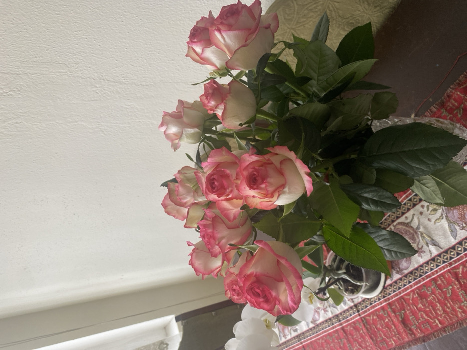 The image depicts an indoor scene in Yerevan, Armenia, focusing on a floral arrangement. A bouquet of approximately a dozen to fifteen bi-colored roses dominates the center, displaying white petals transitioning to vibrant pink at the edges and inner parts. The roses are held in a partially visible clear glass vase. To the left, a white orchid plant with visible roots is contained in a small dark pot. Both floral elements are situated on a dark brown wooden surface. This surface is partially covered by a decorative table runner, which is predominantly red with intricate white and light-colored patterns, including stylized pomegranates and geometric designs. The background is a textured, light beige wall, with a segment of a white window frame visible on the far left, indicating an external light source. No people are present.