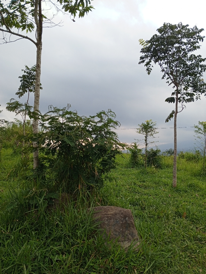 The scene depicts an outdoor, natural landscape located in Thotagamuwa, Sri Lanka, under an overcast sky casting diffuse light. The terrain consists of undulating ground extensively covered with vibrant green grass and various herbaceous plants of differing heights. A single, dark grey, irregularly shaped rock, approximately 0.5 meters in diameter, rests in the lower-center-right foreground, partially concealed by the surrounding vegetation. Two prominent, slender trees with light-colored, smooth bark and sparse green foliage stand upright; one on the left, with its upper canopy extending out of frame, and another on the right. Centrally in the midground, a dense, multi-stemmed shrub with dark green, fern-like leaves is positioned. Additional smaller trees and bushes are scattered throughout the midground. The distant background presents a hazy horizon with faint outlines of undulating hills or mountains. A subtle, thin, dark horizontal line, possibly a wire, traverses the distant midground. No human figures, animals, or man-made structures are present within the visible area.