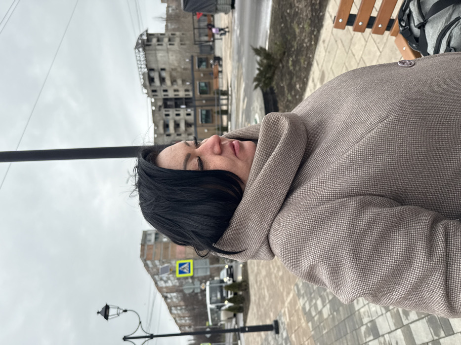 The image depicts a woman in profile, facing right, on a paved sidewalk in Makiivka, Ukraine, under an overcast sky