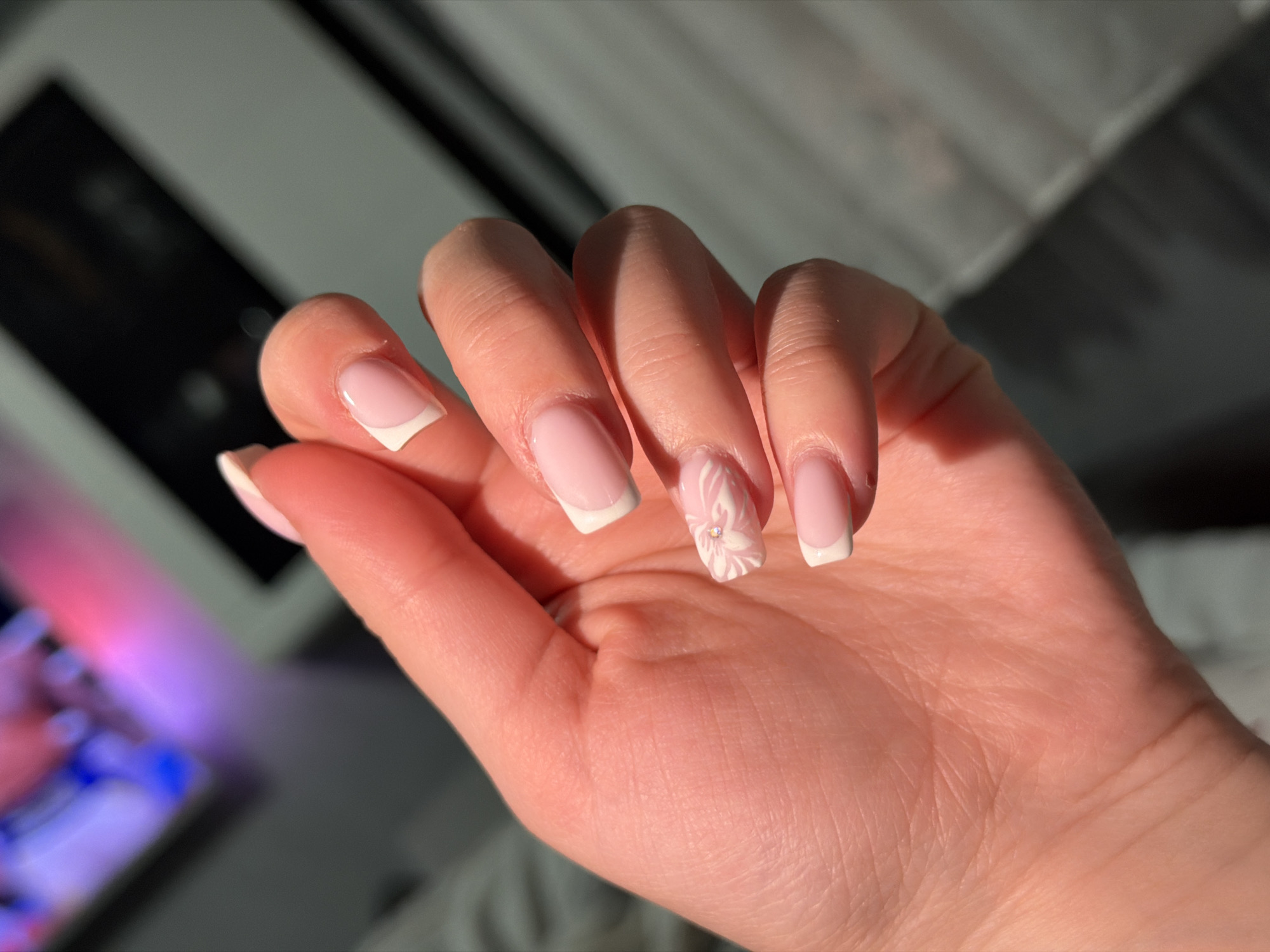 A close-up photograph captures a human left hand, palm oriented towards the viewer, with fingers slightly curled. The hand exhibits light-toned skin. All visible fingernails (thumb, index, middle, ring, and pinky) are professionally manicured in a French style, featuring a light pink nail bed and distinct white tips. The ring finger's nail is further adorned with a white, three-dimensional, floral or bow-like design, centrally accented by a small, clear gemstone. The background is severely out of focus, displaying indistinct shapes and ambient lighting, including diffuse purple and blue hues in the upper left, and a lighter, rectangular object to the right. The setting appears to be indoors. No discernible features are present to identify a specific location within the city of Goce Delcev, Bulgaria. No other individuals or actions are visible.