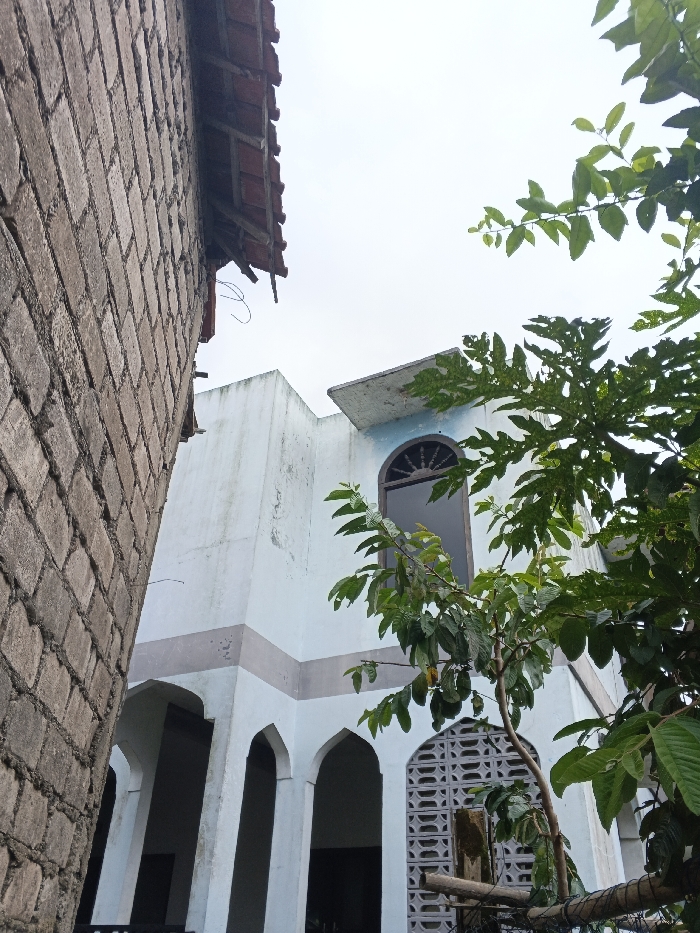 The scene depicts a low-angle view of architectural structures and foliage under an overcast sky in Pinnwe, Myanmar (Burma). In the left foreground, a weathered brick wall with visible mortar lines rises vertically, partially obscured by shadow. Above this wall, a portion of a tiled roof with exposed wooden rafters and minor damage, including bent wires, is visible against the sky. To the right, a multi-story building, primarily white with a horizontal grey band and a light blue section around an upper window, dominates the midground. The lower visible section of this building features multiple pointed archways. An arched window, dark and recessed with vertical internal detailing, is present on an upper floor, topped by a flat concrete overhang. Adjacent to the archways on the right, a white decorative screen or ventilation block with geometric cutouts is visible. Green foliage from several trees and shrubs partially frames the building on the right and extends into the sky, with some leaves exhibiting visible wear or damage. The sky is uniformly light grey and overcast. No individuals are present.