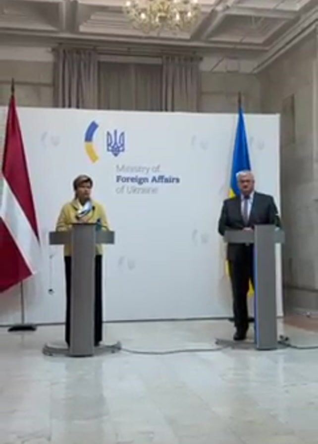 Two individuals, a woman and a man, stand at separate podiums in a formal setting. The woman, on the left, wears a yellow jacket and dark pants. The man, on the right, is dressed in a dark suit and tie. Behind them, a backdrop displays the logo of the Ministry of Foreign Affairs of Ukraine flanked by the flags of Latvia (left) and Ukraine (right). The room features a marbled floor, ornate ceilings, and a chandelier. Both figures appear to be addressing an audience, likely delivering statements or participating in a press conference.