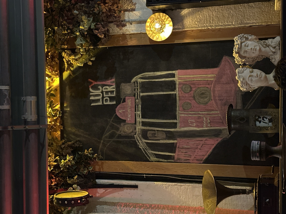 This image depicts an interior decorative arrangement in Beyoğlu, Turkey. The central feature is a large, dark rectangular chalkboard displaying a chalk drawing of a red vintage tram, numbered "47". Above the tram, the words "LUCY PERA" are inscribed in white chalk, with the "Y" of "LUCY" and the "A" of "PERA" rendered in pink. A destination sign on the tram's roof indicates "1 TAKSİNTÜNEL" in pink chalk. Below the chalkboard, a wooden shelf holds several objects. From left to right: a vintage gramophone with a brass horn; a dark, cylindrical object resembling an urn; a small framed picture of a dark-haired individual; a partial view of a light-colored lamp base; and two white classical-style busts depicting female heads with elaborate hairstyles. The crown of a person's dark head is visible in the lower foreground. Above the chalkboard, artificial foliage in shades of green and autumnal colors is arranged, illuminated by a hidden yellow-orange strip light. Two circular, wall-mounted light fixtures are present: one on the far left with a red glow and a yellow rim, and another on the far right emitting bright yellow light. Overhead, dark metal structural elements are visible. The surrounding walls are textured, appearing white on the left and darker on the right.