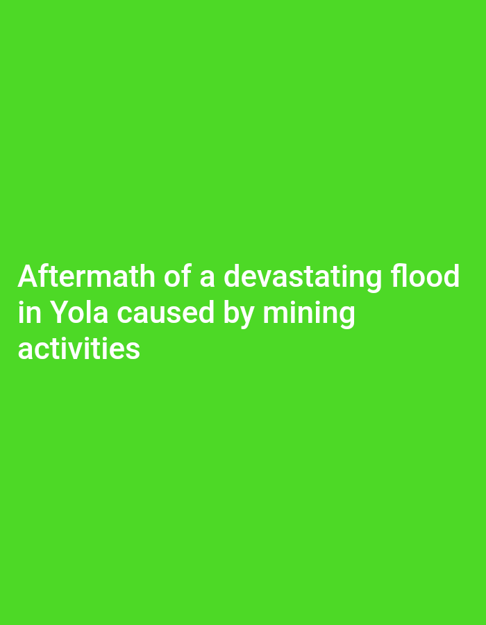 This image displays a solid, vibrant green background. Centered horizontally and positioned in the lower half of the frame is white sans-serif text. The text reads: "Aftermath of a devastating flood in Yola caused by mining activities". No people, subjects, objects, actions, interactions, or environmental details of a flood or Yola, Nigeria are visually depicted in this image; it solely presents a textual statement on a monochromatic background.