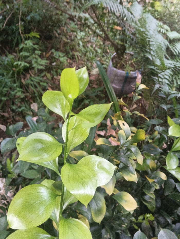 The scene depicts a dense vegetated area in Kon Tum, Vietnam. In the foreground, a prominent plant stem with multiple glossy, ovate leaves in a bright light green color extends vertically. The leaves exhibit visible venation. To the right of the central plant, in the midground, additional foliage features darker green leaves with some showing yellowing. A repurposed grey plastic bottle, possibly a container, with a dark blue or green strap is partially visible among the plants in the midground, situated behind the foreground foliage. The background consists of a blurred mass of green plant life, including ferns, indicating a lush, natural environment. No human subjects or discernible actions are present.