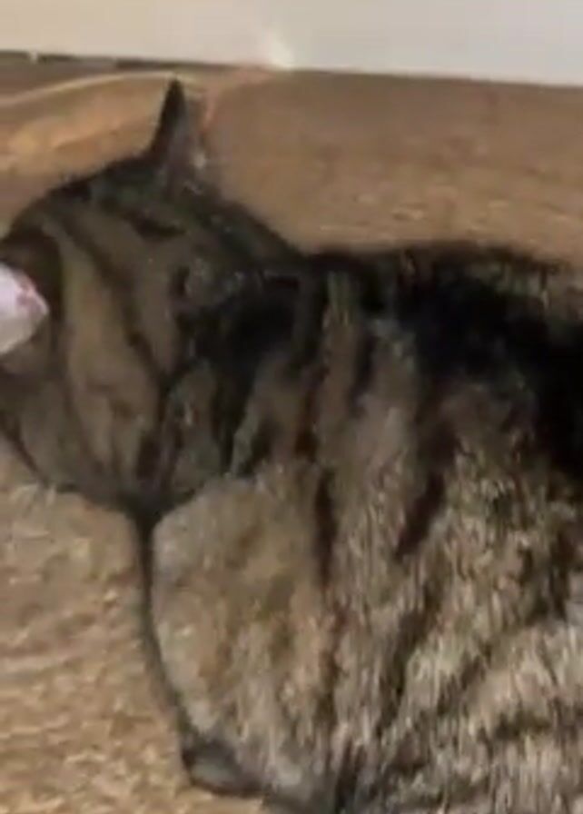 cat lying on a rug. The cat has a dark tabby coat with black stripes and a brown undertone. The rug is a light brown, woven material. The cat moves slightly and appears to be sleeping. A hand reaches into the frame briefly and touches the cat. The cat remains mostly still. The background is blurred, but it appears to be an indoor setting.
