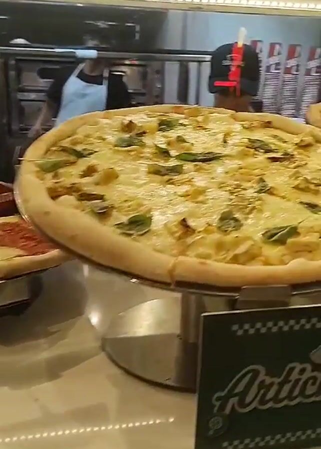 display case at Sbarro with several pizzas. The leftmost pizza is an artichoke pizza, with a creamy white sauce, artichoke pieces, and basil. To the right of it, on a higher tier, is a pizza with red sauce and pepperoni. To the right of that is a square pizza with a light sauce and dark drizzle. Behind the display case are two ovens and two employees wearing dark clothing. One is wearing a black baseball cap. There is a Sbarro sign above the display case.