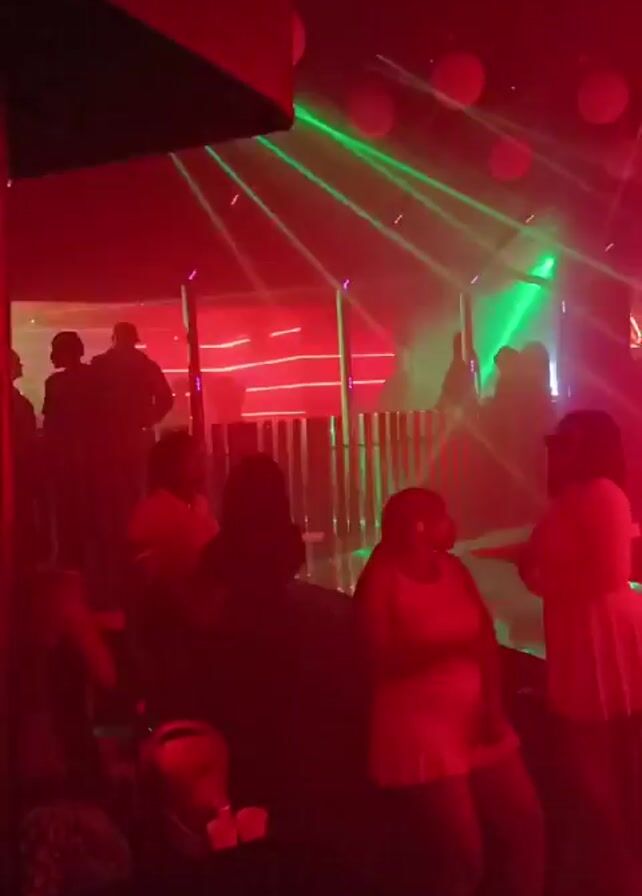 The scene is a dimly lit nightclub with red and green lighting. Several people are standing and dancing. There's a raised platform with more people on it, partially obscured by the low light and the vertical columns of the structure. The lighting shifts rapidly between red and green. Most individuals are silhouetted against the lights, making details difficult to discern. A red bucket is visible near the bottom of the frame. The overall atmosphere is energetic and festive.