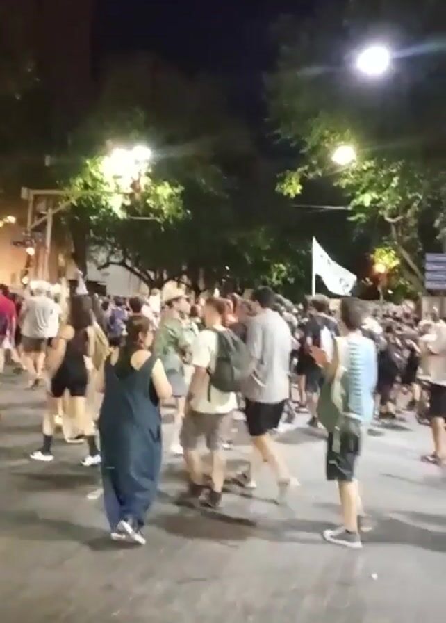 crowd of people gathering in a street at night. The environment is illuminated by streetlights and the moon. There are trees lining the street. The crowd seems to be celebrating or protesting, as some people are waving a flag and there is a drum beat. People are dressed in casual clothes. Some individuals are carrying backpacks. A bicycle is also seen in the crowd.