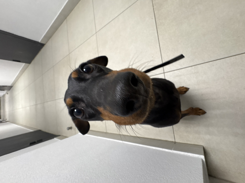 - "The image captures a low-angle, wide-angle close-up of a small black and tan dog, consistent with breeds such as a Miniature Pinscher or a Doberman Pinscher puppy, centered in the foreground" by FM-Bmsku2, licensed under CC BY 4.0