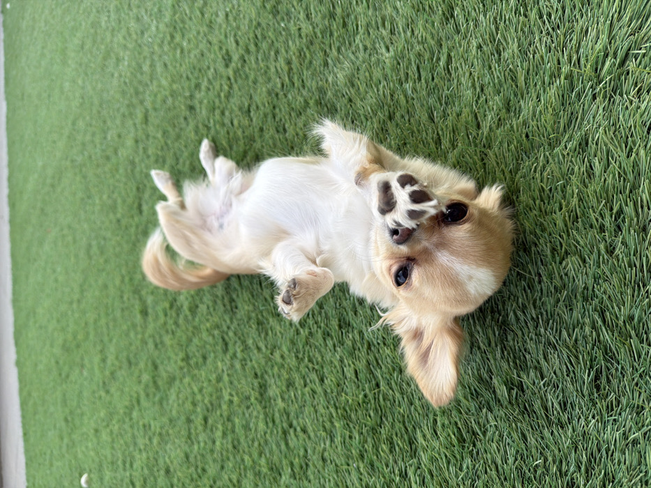 A light tan and cream-colored dog, consistent with a small breed such as a Chihuahua, is depicted lying supine on a uniformly green, short-pile artificial turf surface