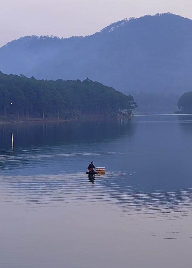lone person sitting on a small, raft-like structure in the middle of a calm lake. The person is facing away from the camera and appears to be engaged in some activity on the raft. The lake is surrounded by trees on the near shore, and a large, misty mountain is visible in the background. The sky is overcast, creating a soft, muted light over the scene. The water's surface has gentle ripples.