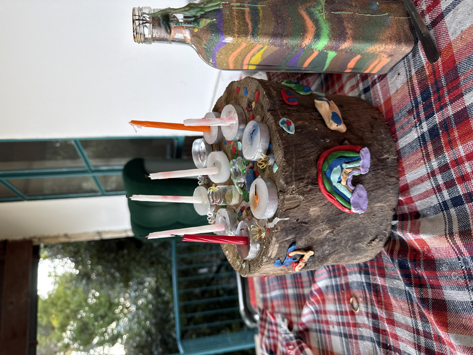 A wooden log decorated with colorful clay and candles sits on a red and white checkered surface. The log has several candles inserted into it, along with small clay figures of a rainbow, cloud, and other abstract shapes. Beside the log, a glass bottle filled with layered colored sand is placed. The objects are partially obscured by what seems to be a porch railing and foliage in the background.