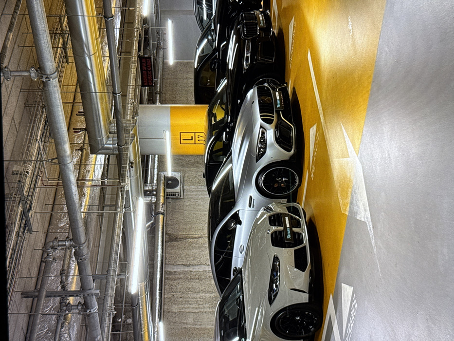 An indoor parking garage features several luxury cars neatly parked in a row. Overhead, a complex network of metal pipes and conduits run along the ceiling. The parking space is delineated by bright yellow lines, creating a sharp contrast against the gray floor. Signage is visible on the walls, indicating parking space numbers, and direction with the word “entrance”.