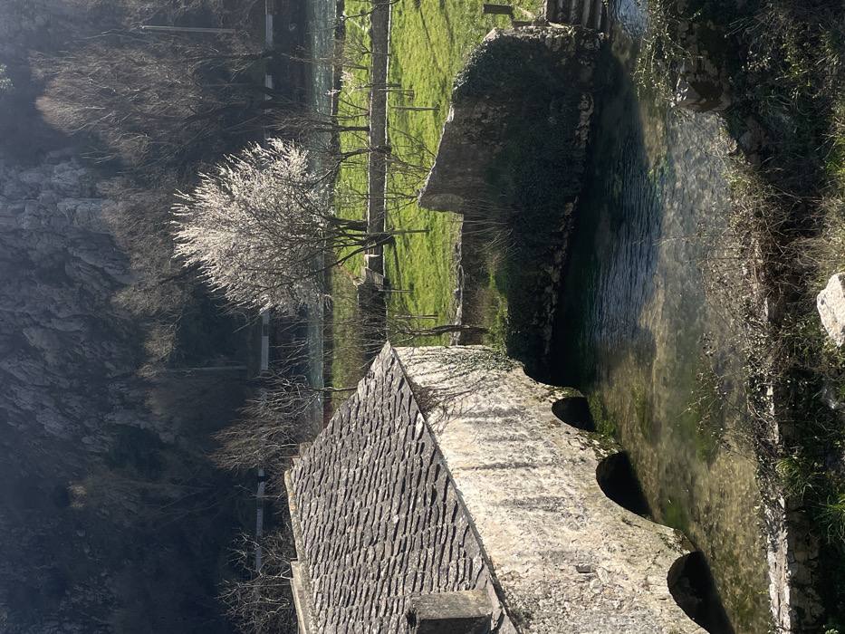 This image depicts a scene in Blagaj, Bosnia and Herzegovina, focusing on a historic stone building adjacent to a clear water body. In the foreground, a multi-arched stone building with a gabled roof covered in grey stone shingles extends from the left into the frame, partially obscuring its full structure. Two prominent arches are visible over the translucent, shallow water, which shows a light green hue from submerged vegetation. The stone walls of the building are light grey, with some dark stains and patches of clinging ivy on the side. A stone chimney is visible on the roofline. To the right of the building, a verdant grassy area is visible, containing several trees. One deciduous tree, centrally located and slightly to the right, is in full bloom with bright white blossoms. Other trees in the grassy area are bare of leaves. Stone retaining walls delineate parts of the grassy area and the edge of the water. Another segment of a stone wall, partially covered in ivy, stands further into the grassy area. Steps made of stone are visible on the far right, leading down towards the water. In the background, beyond the grassy area and trees, a substantial rocky mountain face rises prominently, appearing rugged and partially covered with sparse, bare trees. The lighting suggests a sunny day, with distinct shadows cast across the scene, particularly on the grassy areas and the building's facade. No individuals or animals are present in the frame.