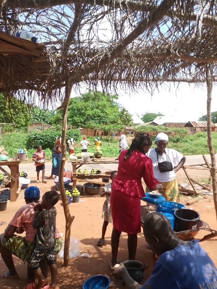 - "The image depicts a bustling outdoor market scene in Ejule, Nigeria, under a makeshift shelter constructed from a lattice of dried branches and leaves supported by wooden poles" by FM-TKrYD3, licensed under CC BY 4.0