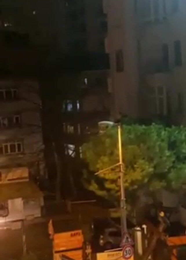 n urban street scene at night. Buildings of varying heights surround the street. A street lamp illuminates a green bush and a speed limit sign. A garbage truck is parked on the side of the road. Cars pass by on the street. There is a building with a sign that says "GROSPER" on it. The overall scene appears to be a typical urban environment at night.