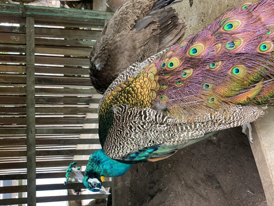The image displays a male Indian Peafowl (Pavo cristatus) in the foreground, standing with its left side partially visible. Its head and neck exhibit iridescent blue-green plumage, topped with a distinctive crest of fanned feathers. A white patch surrounds its eye, and a yellow area is visible near its beak. The bird's back features a transition from metallic green and gold feathers to intricate black and white patterned feathers on its wings. Its prominent train consists of numerous long, fanned feathers displaying vibrant hues of purple, green, and gold, each adorned with distinct ocelli (eyespots). The peacock is positioned over dark brown soil/dirt. In the mid-ground, to the right of the male peacock, the back and partial side of a second, mostly brown bird, consistent with a peahen or another peafowl without a developed train, is visible. The background consists of a wooden slatted fence or enclosure wall, allowing diffuse light to pass through. A light-colored concrete or wooden ledge is present in the immediate foreground. This scene is consistent with an animal exhibit found in a park or zoo within Pattaya City, Thailand.
