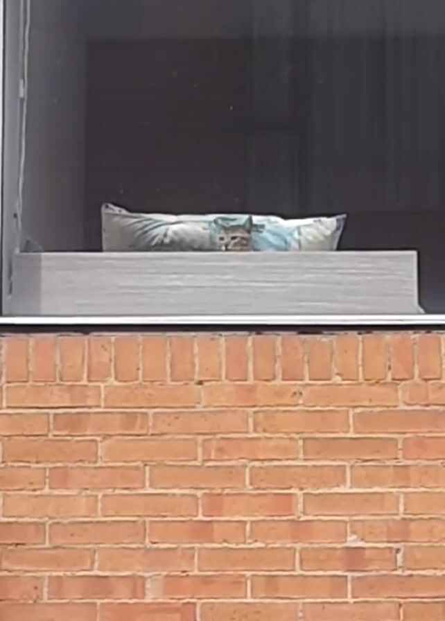 A cat is seen in a window from the outside. The cat is lying on a pillow on the windowsill. The building is made of red brick. The window is reflective.