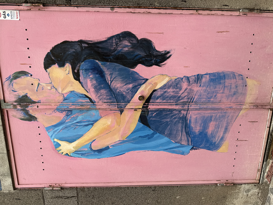 - "A detailed street art mural, depicting a man and a woman kissing and embracing, is painted on a pink metal utility access door in the city of Funchal, Portugal" by FM-9sj3r2, licensed under CC BY 4.0