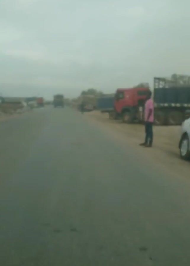 paved road with several large trucks parked on the right side. A man in a pink shirt and dark pants stands near a silver car parked behind a red truck. As the video progresses, the camera moves forward, revealing more parked trucks of various colors. One man in dark clothing can be seen standing near one of the trucks. The sky is overcast, and the overall environment appears somewhat dusty.