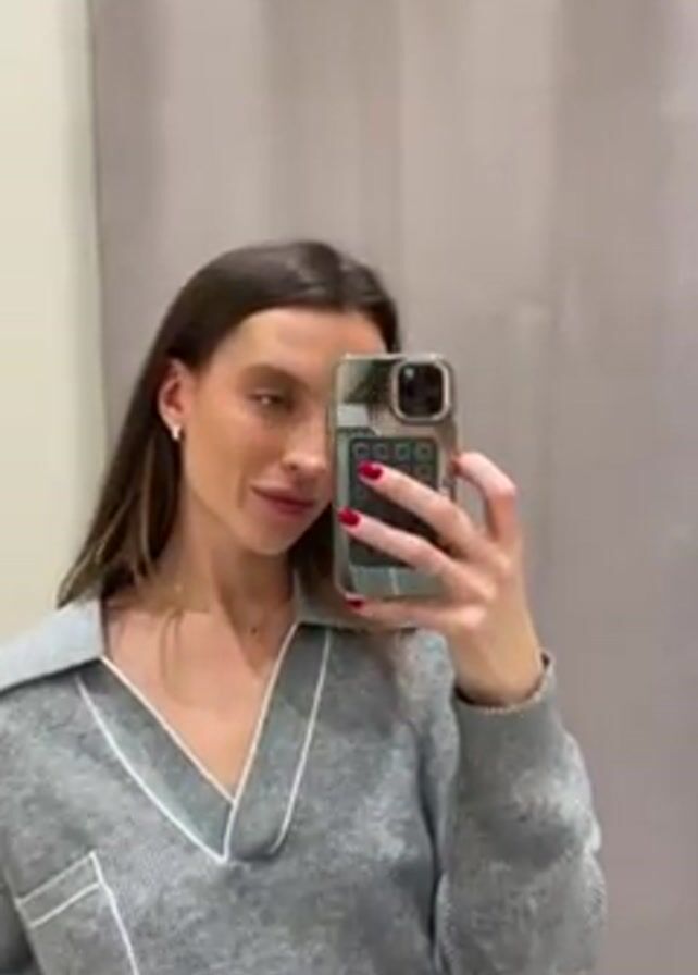 A woman takes a selfie in a fitting room. She is wearing a grey sweater with white trim and light-wash jeans. Her nails are painted red. The fitting room has a grey curtain. She adjusts her hair while holding her phone.