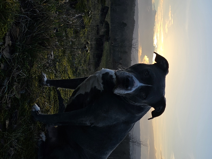 - "A gray and white dog with floppy ears sits on a grassy hill at sunset" by FM-n22Rc2, licensed under CC BY 4.0