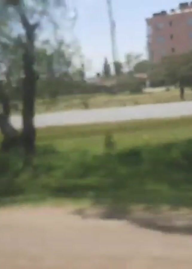 view from a moving vehicle, focusing on the roadside scenery. A two-lane road runs parallel, with cars, vans, and a tanker truck traveling on it. A green, grassy area lies between the road and the camera, punctuated by trees. In the background, there are buildings, including a multi-story pink building, and communication towers. The sky is partly cloudy.
