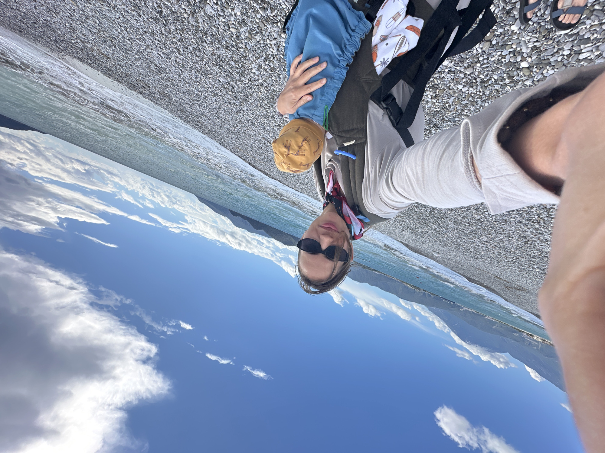 A selfie shows a person wearing sunglasses, standing on a pebble beach in Fethiye, Turkey. The person has a child secured in a carrier against their chest. The background includes a clear blue sky with scattered white clouds, a calm body of water, and distant mountains. The beach consists of small, smooth pebbles. The person is wearing a light-colored shirt and sandals.