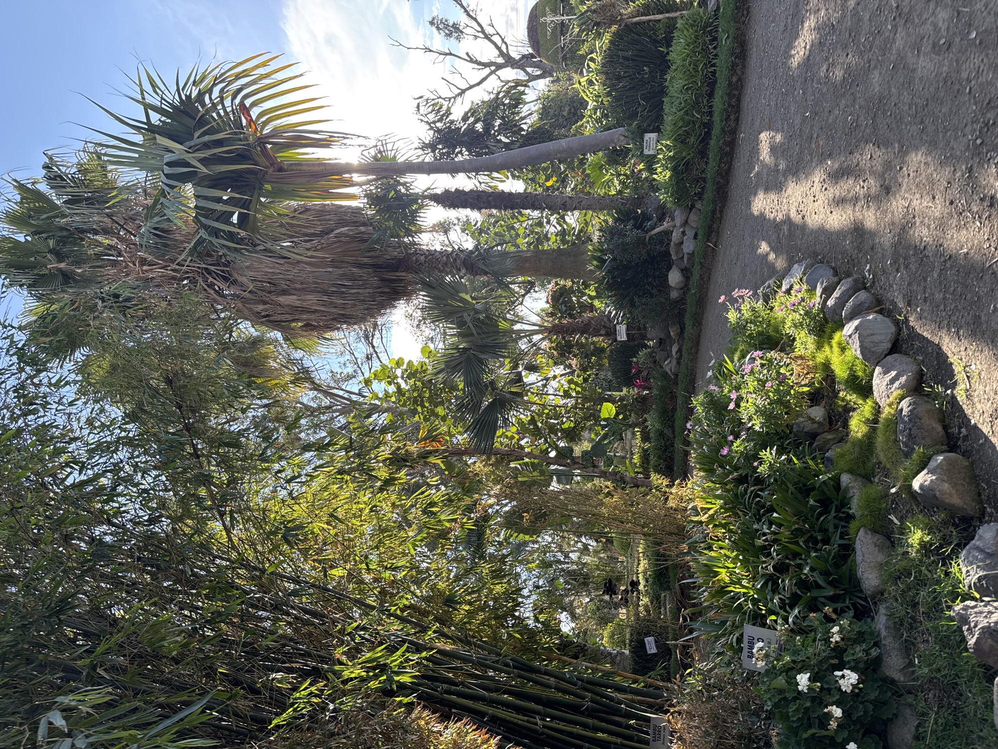 The image depicts a botanical garden pathway in Santa Ana Yancuitlalpan (Chilhuacán), Mexico. The path, composed of packed dirt, is flanked by dense vegetation. On the left, stands of bamboo grow tall, their leaves catching sunlight. Palm trees of varying heights are also present, silhouetted against the bright sky with scattered clouds. On the right, a rock border contains a variety of flowering plants and greenery. Small identification markers are placed near the plants. The sun is shining brightly, creating high contrast and casting shadows across the scene.