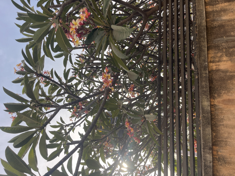 A low-angle shot reveals a plumeria tree in full bloom, its large, green leaves and clusters of pink and yellow flowers reaching towards the bright, sunny sky. The tree is partially obstructed by a dark, vertical metal fence. To the right of the fence, a textured concrete wall displays mottled brown and grey tones. The light filters through the leaves, creating a luminous effect around the branches.