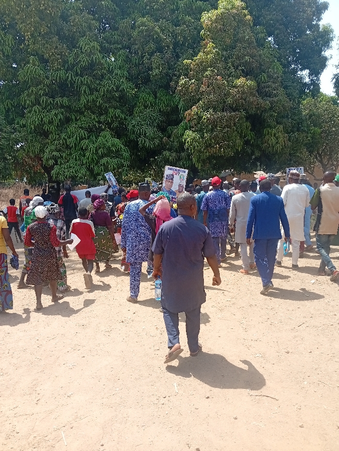 The image depicts an outdoor gathering of approximately 50-70 individuals moving along a dry, unpaved path in Andaha, Nigeria. Large, leafy green trees form the background under a bright, clear sky, casting distinct shadows of people on the ground. The crowd consists of men and women of varying ages, predominantly adults. Many are dressed in patterned traditional Nigerian attire, including tunics, trousers, and dresses in various colors such as blue, red, and white. Several individuals are holding political campaign posters aloft; one prominently visible poster displays images of two men, one in a red cap, with text including "BAKATAYAMU" and "SENATE." Other less distinct posters are also present. In the immediate foreground, a man, seen from behind, wears a dark blue tunic and trousers, carrying a clear plastic water bottle in his right hand. A woman in a red dress holds a white piece of paper. The general action observed is a collective movement of the crowd forward along the path.
