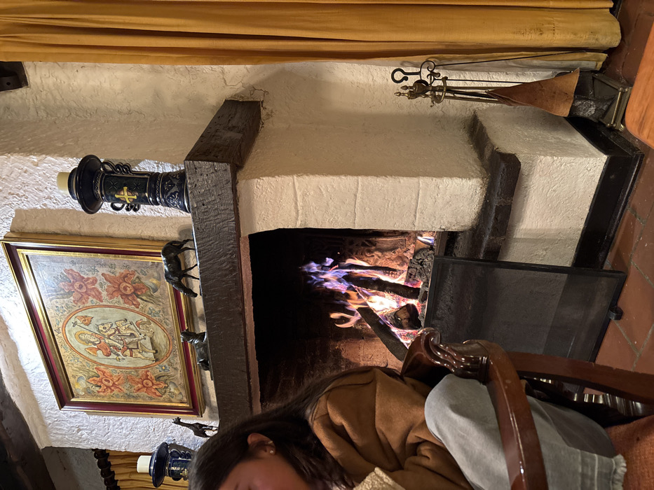 This image depicts an interior scene in Huasca de Ocampo, Mexico, characterized by a rustic aesthetic. The central element is a stucco fireplace, painted off-white, with a dark wooden mantelpiece. An active fire burns within the hearth, showing logs with orange, blue, and purple flames. A black metal mesh fire screen stands upright in front of the opening. Above the mantel, a large framed artwork is mounted on the wall. It features a gold frame and an oval central motif depicting two stylized figures, one mounted on a horse, surrounded by a pattern of orange and red flowers. On the mantelpiece, from left to right, are a dark blue ceramic candlestick with a white candle, a small dark giraffe figurine, two dark animal figurines (one possibly a lounging dog, the other a grazing horse), and another dark blue ceramic candlestick with a white candle. To the left, a partial view of an individual is visible. This person has dark hair, a light brown/tan jacket with a lighter lining near the collar, and light grey pants. They are seated in a dark wooden armchair, facing towards the fireplace. Only the right side of their face, ear (with a small earring), and shoulder are visible. To the right of the fireplace, a set of brass fireplace tools (poker, tongs, brush) hangs on a stand. The walls throughout the visible area are textured and painted off-white. A section of a gold-orange textured curtain panel is visible on the far right. The floor consists of reddish-brown tiles, and dark wooden beams are partially visible on the ceiling in the upper left.