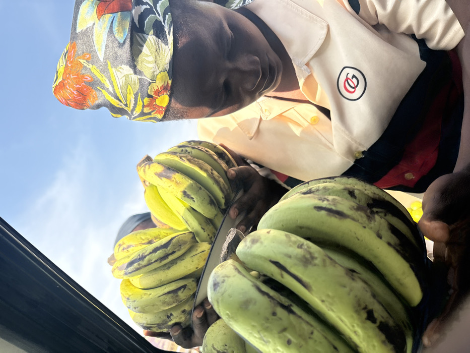 An outdoor scene in Karshi, Nigeria, depicts a transaction. A female individual, positioned on the right, wears a light yellow polo shirt with a lower striped section (dark blue, red, light blue) and a circular "GC" or "GG" logo, along with a multi-colored floral headwrap. Her gaze is directed downwards. Her dark-skinned left hand is visible in the foreground, holding a large bunch of green-yellow bananas marked with dark vertical striations. In the middle ground, a separate pair of dark-skinned hands holds a white plate containing a smaller bunch of similar bananas. The background consists of a clear blue sky and a dark element in the upper left, consistent with a vehicle's interior frame.