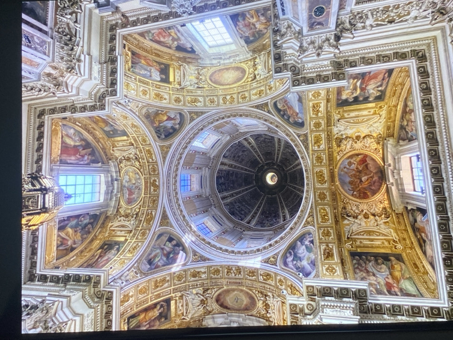 The image displays the ornate Baroque interior ceiling and central dome of the Basilica di Santa Maria Maggiore in Rome, Italy