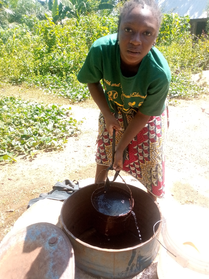 A young woman, wearing a green t-shirt with partial text "Health and Medical Educatio" and a multi-colored patterned skirt, is depicted drawing water in Agban, Nigeria. She is bent over, holding a black strap attached to a small, dark metal bucket filled with water. This bucket is being lifted from inside a larger, rusty, open metal barrel. Water is visibly spilling from the small bucket. A rusted, blue metal lid rests on the sandy ground to the left of the barrel. A black strap object lies on the ground nearby. To the right, a white plastic container is partially visible. The background consists of dense green vegetation under bright daylight.