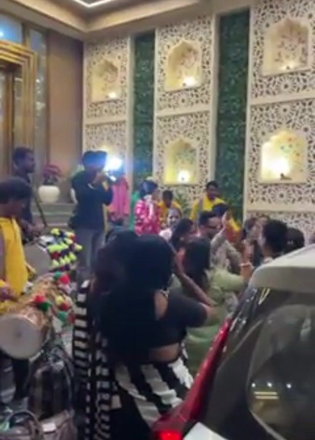 The scene captures a lively indoor gathering, likely a celebration, with numerous people of varying ages dressed in colorful attire. A group of musicians, some in yellow shirts, play traditional drums and horns, creating a festive atmosphere. People are dancing, clapping, and interacting with each other, showcasing joy and excitement. The setting appears to be an ornate hall or entrance, with decorative wall panels featuring intricate patterns and greenery. Suitcases and bags are visible near the entrance, suggesting that people may be arriving or departing. A portion of a silver or white car is also in view. The overall ambiance points to a cultural event, perhaps a wedding or festival.