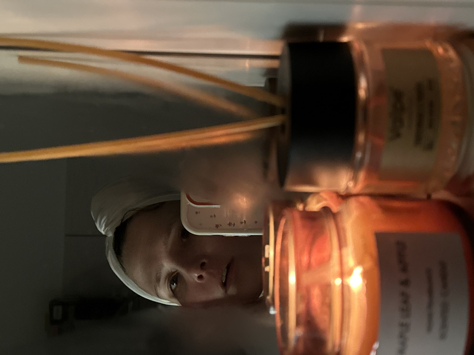A female individual is reflected in a mirror, visible from the upper chest. She wears a white towel wrapped around her head and holds a white smartphone, which has a light-colored, possibly floral-patterned case, angled to capture the reflection. In the immediate foreground, on a flat surface, are two glass objects. To the left, a lit "MAPLE LEAF & APPLE Scented Candle" in an orange-tinted clear glass jar displays an active flame. To the right, a "Voluspa" (or similar branded) reed diffuser in a clear glass jar with a black cap contains an orange liquid and several light-colored reeds. The scene takes place within an indoor room, which is dimly lit, with the background behind the reflected individual appearing dark and indistinct.