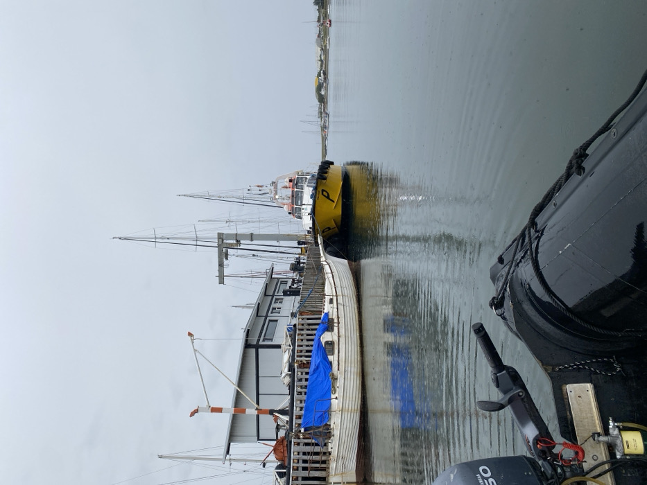 Boats are moored along a dock in overcast weather. A yellow tugboat is visible, along with sailboats and a white boat covered in blue tarp. The water reflects the boats and sky. A black boat with an outboard motor is in the foreground, partially obscuring the view. Distant buildings are across the water in the background.