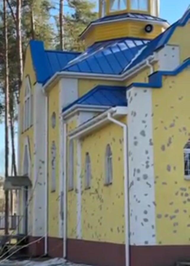 side and roof of a yellow church, heavily damaged with multiple impacts along the walls