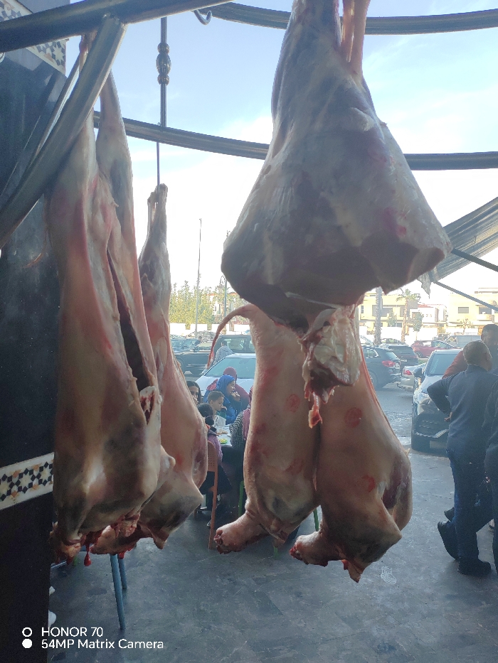 Several skinned animal carcasses hang from a metal rack in front of a building. The carcasses appear to be lambs or goats, cleaned and ready for sale. People are dining at tables visible through the hanging meat. Cars and buildings are seen in the background. A smartphone watermark is visible at the bottom.