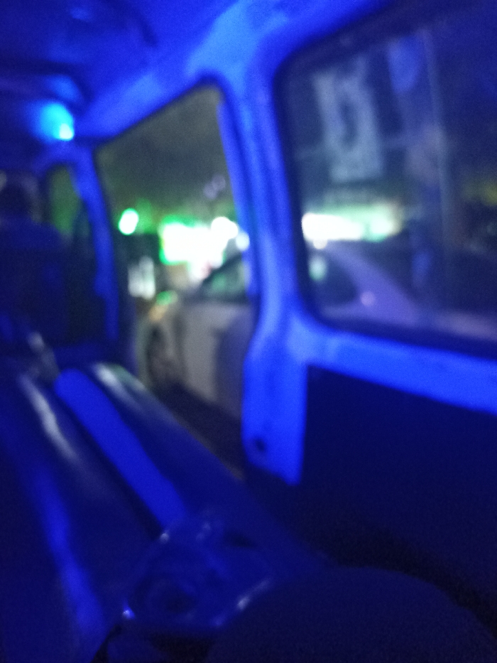 The image depicts a heavily blurred, blue-tinted nighttime scene viewed from inside a vehicle in Dahiyat Qudsaiya, Syria. The interior of the vehicle is illuminated by a strong blue light, highlighting a curved seat or panel on the left and parts of the window frame and door panel on the right. A distinct, glowing blue light source is visible in the upper left interior. Through the vehicle's windows, an indistinct street environment is visible, characterized by numerous out-of-focus green and white light sources. A blurry white vehicle is discernible in the mid-ground, positioned outside the observer's vehicle. No individuals or specific actions are identifiable.